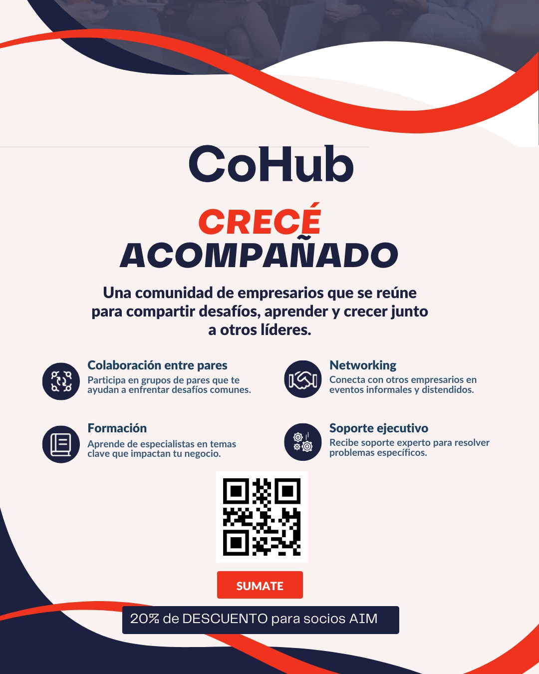 20% de descuento para asociados AIM - CoHub es una comunidad de empresarios que se reune para compartir desafíos reales, aprender de la experiencia de otros y tomar mejores decisiones.